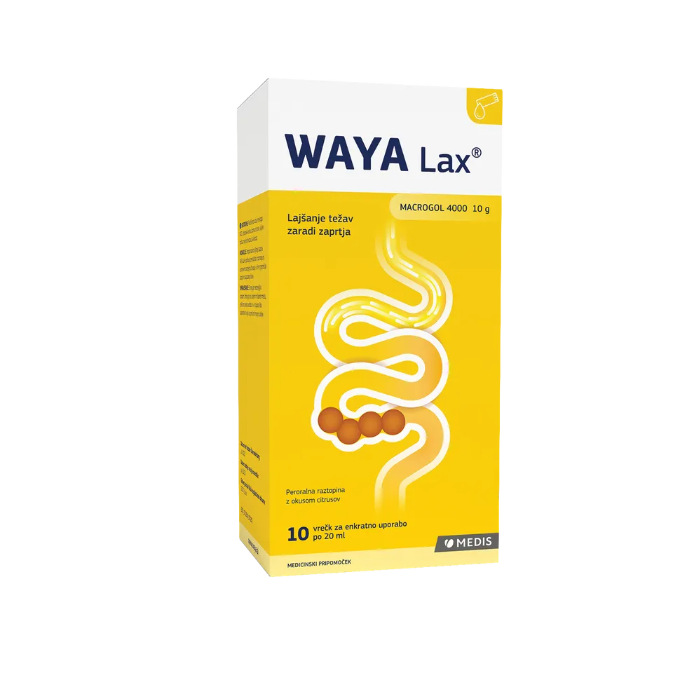 Peroralna raztopina WAYA Lax® je medicinski pripomoček na osnovi makrogola 4000, ki nežno in učinkovito odpravlja zaprtje. Izdelek z osmotskim mehanizmom ureja delovanje črevesa in lajša težave zaradi zaprtja.