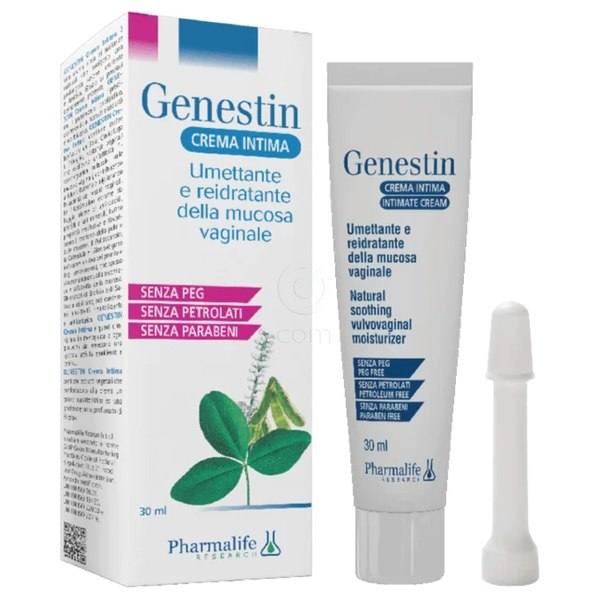Genestin intimna krema vsebuje rastlinske izvlečke soje, grozdnate svetilke in črne detelje z izoflavoni, izvlečke aloe vere, vrtnega ognjiča, navadne krvenke in laškega smilja. Dodan je polidokanol, vitamin E in hialuronska kislina, ki vzdržuje vlažnost sluznice.