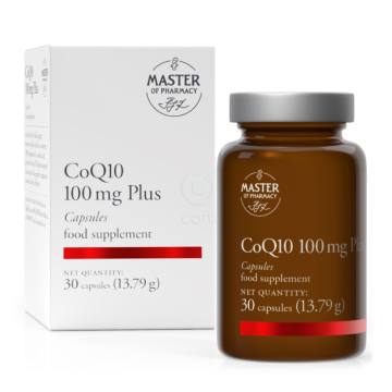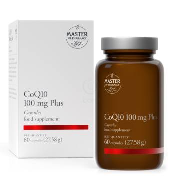 Master of Pharmacy CoQ10 100 mg Plus prehransko dopolnilo vsebuje koencim Q10, vitamin C ter vitamin E. Vitamin C ima vlogo pri nastajanju kolagena za normalno delovanje žil in kože.