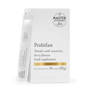Master Of Pharmacy Probifast je prehransko dopolnilo na osnovi mikroorganizmov z vitaminom D in jagodičevjem za podporo imunskemu sistemu. Prašek s sladilom.