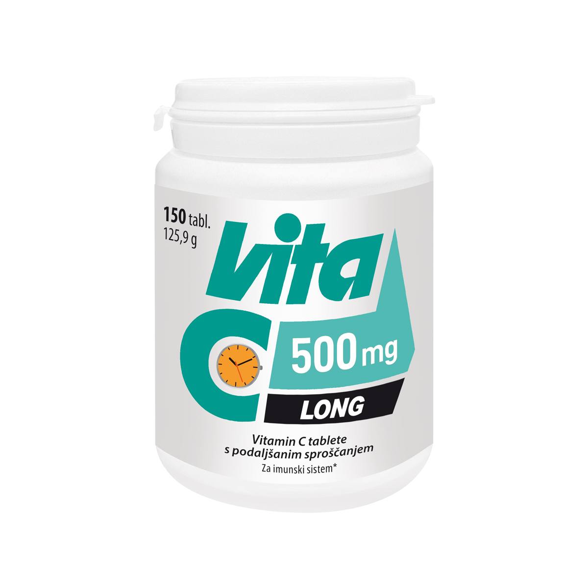 Vita C 500 mg Long so tablete s podaljšanim sproščanjem z vitaminom C, ki se v črevesju počasi raztopi v 8-9 urah. Vitamin C se enakomerno sprošča, tako da ga telo izkoristi čez dan.