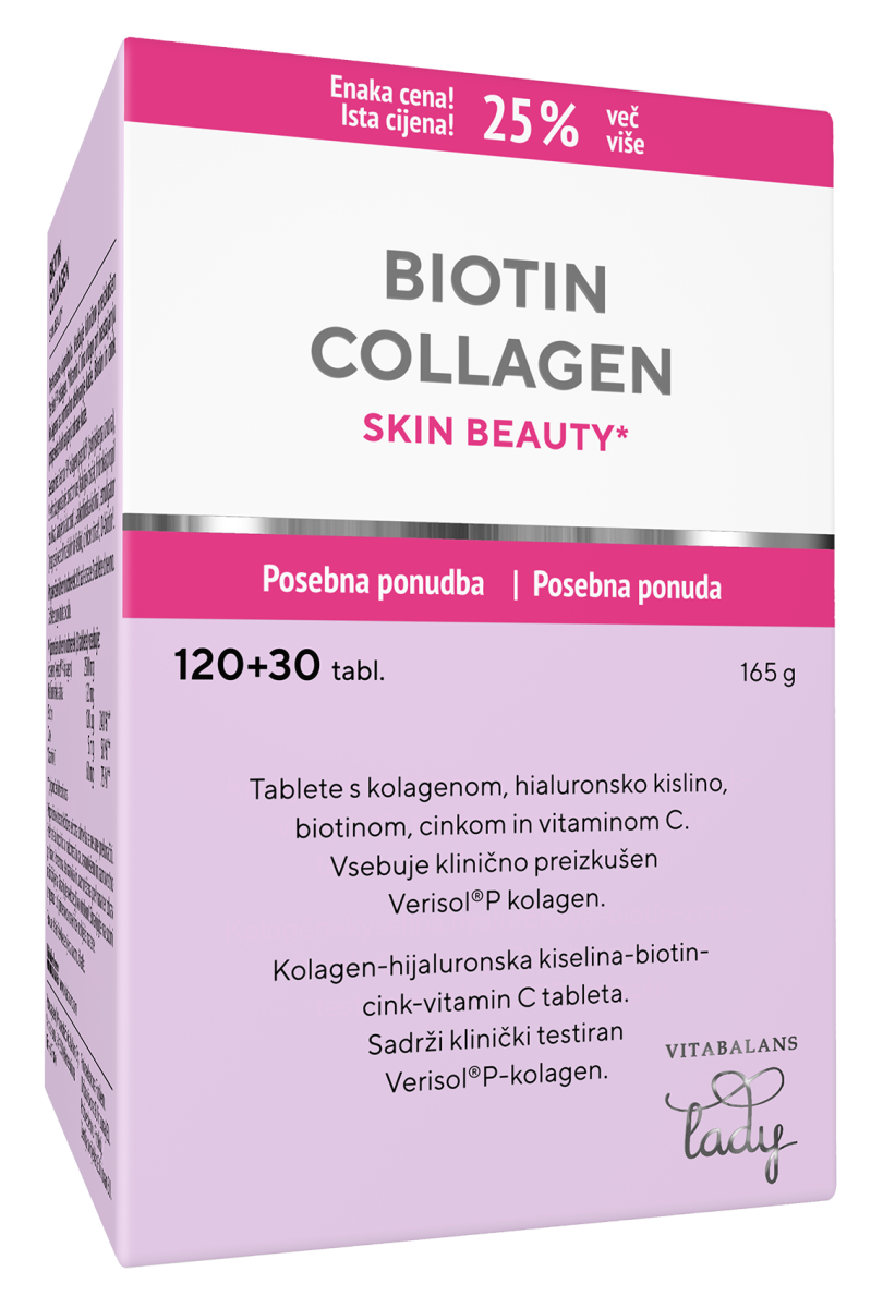 Biotin Collagen vsebuje poleg Verisol® P kolagen peptidov tudi ključne sestavine za ohranjanje zdrave in navlažene kože. Hialuronska kislina, biotin, vitamin C in cink so hranila, ki povečajo učinek kolagena in pomagajo izboljšati kakovost kože. Hialuronska kislina je naravna sestavina kože, ki skrbi za hidratacijo, saj nase veže vodo in jo zadrži v koži. Biotin in cink dodatno prispevata k normalni in zdravi koži, vitamin C pa poskrbi za naravno tvorbo kolagena v koži.