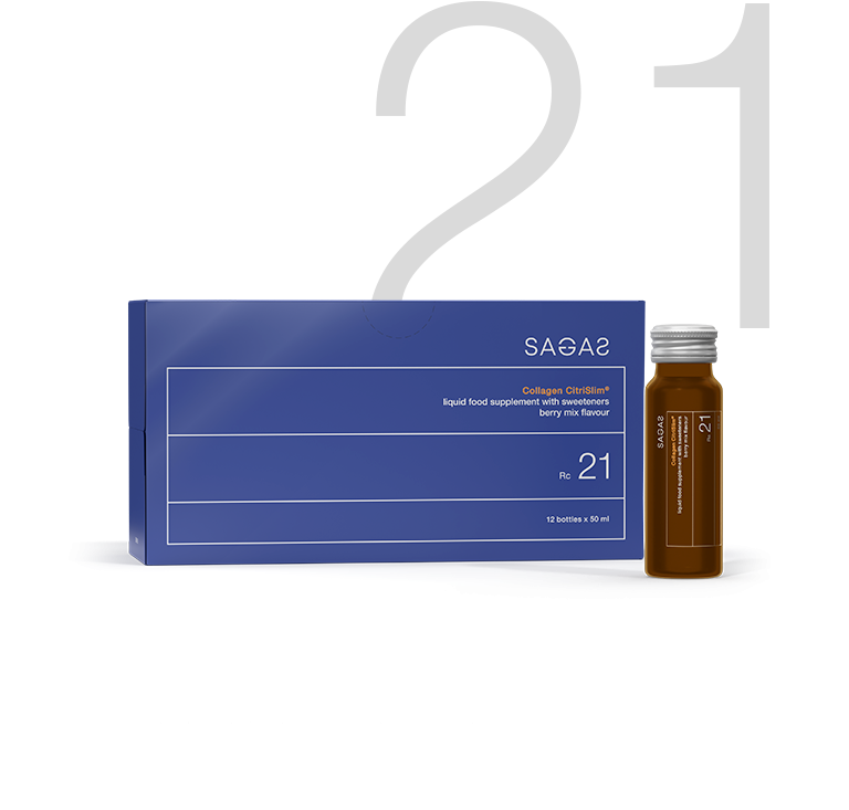 Sagas Rc 21 Collagen CitriSlim je edinstveno tekoče prehransko dopolnilo s formuliranimi sestavinami, ki podpirajo telo in varujejo kožo. Vsebuje skrbno uravnotežene sestavine, ki imajo sinergijsko delovanje za doseganje želenih rezultatov – 20.000 mg CitriSlim® izvlečka nezrelega ploda ponkan mandarine ( Citrus reticulata ), 10.000 mg hidroliziranega morskega kolagena Jellice® in 10 mg praha nizkogrmaste borovnice (Vaccinium angustifolium).