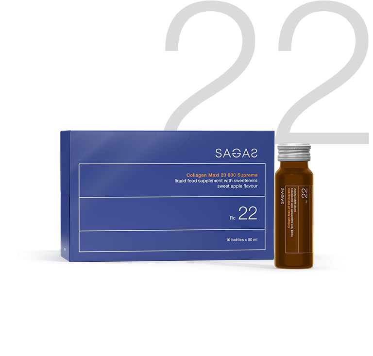 Sagas Rc 22 Collagen Maxi 20 000 Supreme – tekoči kolagen je pakiran v praktične stekleničke po 50 ml. Neposredno uživanje iz stekleničke omogoča hitro in enostavno uporabo, možno pa je mešanje s sokom, vodo ali smoothiejem. Zahvaljujoč napredni tehnologiji je naravni okus kolagena učinkovito prikrit in s tem poudarjen svež in izrazit okus jabolka, zaradi česar je izdelek izjemno prijeten za uživanje.
