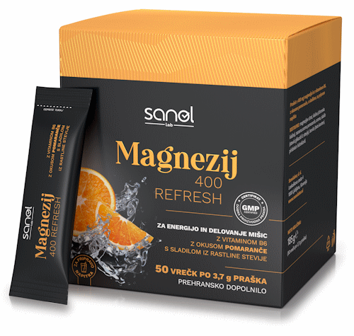 Sanol LAB Magnezij 400 Refresh vsebuje 50 vrečk za pripravo okusnega napitka z okusom pomaranče. Sanol LAB Magnezij 400 Refresh je na voljo tudi v pakiranju po 20 vrečk.