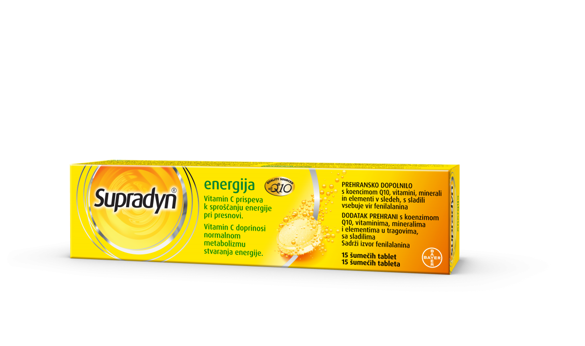 Supradyn Energija Q10 15 šumečih tablet so prehransko dopolnilo s koencimom Q10, vitamini, minerali in elementi v sledeh, s sladili. Vsebuje vir fenilalanina.