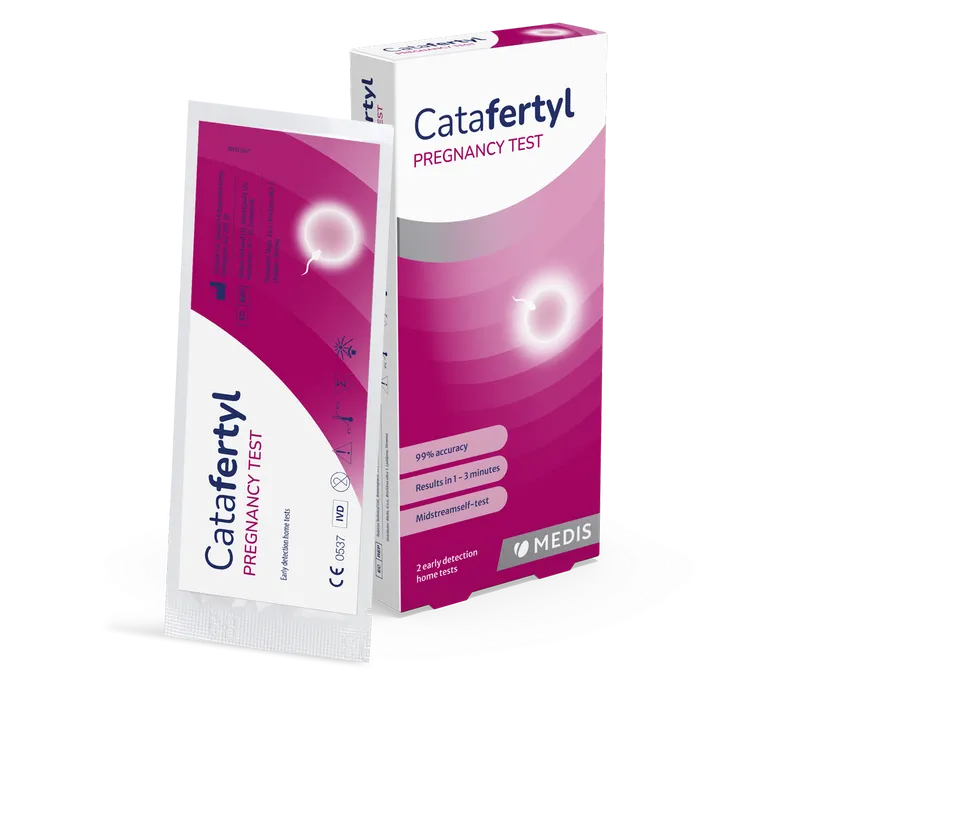 Catafertyl test za zgodnje ugotavljanje nosečnosti za domačo uporabo je enostaven za uporabo in deluje tako, da zazna povišane ravni humanega horionskega gonadotropina (hCG) v urinu – hormon, ki ga telo proizvaja med nosečnostjo.