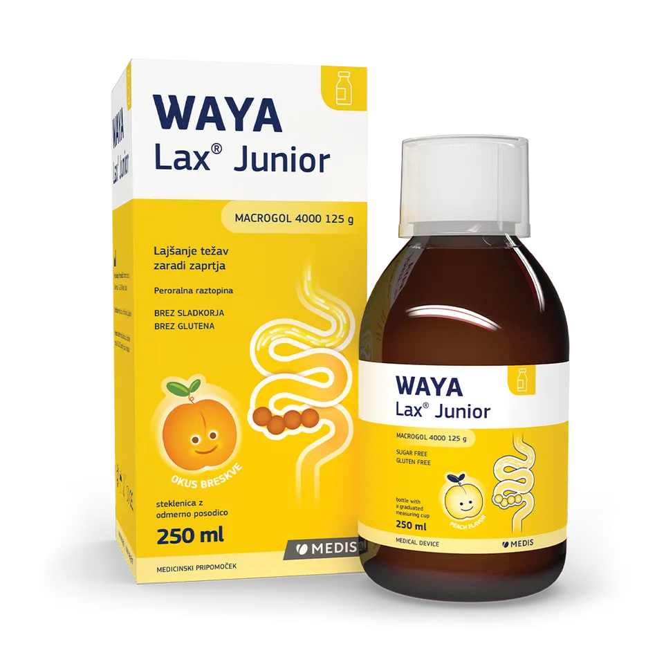 Peroralna raztopina WAYA Lax Junior je medicinski pripomoček na osnovi makrogola 4000, ki nežno in učinkovito odpravlja zaprtje. Izdelek z osmotskim mehanizmom ureja delovanje črevesa in lajša težave zaradi zaprtja, kot so: kronična zaprtost, fekalom (stanje vztrajne zaprtosti s kopičenjem blata v danki in/ali debelem črevesu) in zaprtost z epizodičnimi ali kroničnimi kolikami.