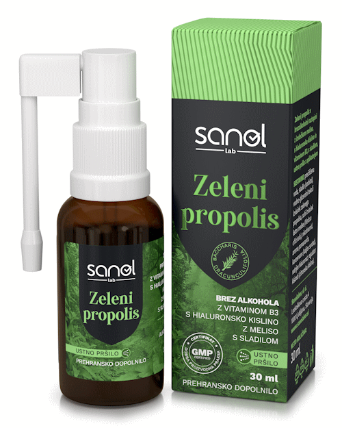Sanol LAB Zeleni propolis v priročnem pršilu vsebuje izvleček zelenega propolisa iz Brazilije, vitamin B3, hialuronsko kislino in meliso.