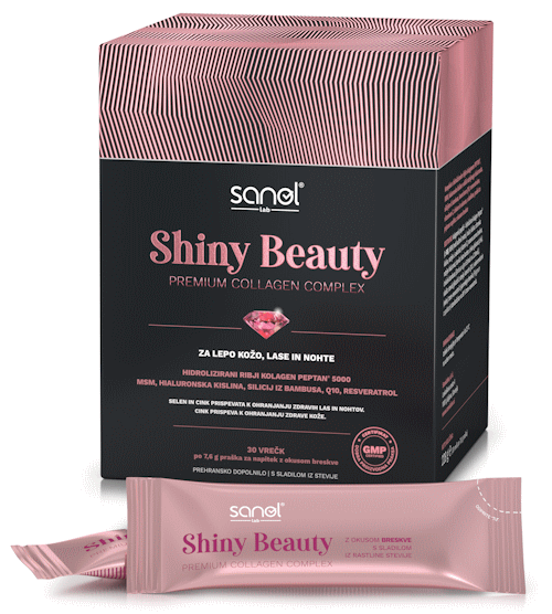 Za lepoto, ki sije! Sanol LAB Shiny Beauty kompleks s patentiranim, hidroliziranim ribjim kolagenom Peptan® in skrbno izbranimi aktivnimi sestavinami naravno podpira vašo kožo, lase in nohte1,2. S S Premium kompleksom z obogateno sestavo, ki vključuje tudi MSM, hialuronsko kislino, silicij iz bambusa, koencim Q10, resveratrol ter vitamin C, cink in selen, vsak dan poskrbite za vašo lepoto, ki bo zasijala od znotraj. Izdelek je brez dodanih sladkorjev, brez glutena in izdelan v Sloveniji.