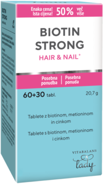 Biotin strong pakiranje 30+ 60 tablet, vsebuje kombinacijo biotina in cinka, ki dokazano prispevata k ohranjanju zdrave kože in las. Potrebna sta za izgradnjo keratina, kateri je ključna sestavina kože, las in nohtov in ki daje nohtom ter lasem trdnost in čvrstost.